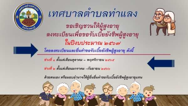 ขอเชิญชวนให้ผุ้สูงอายุในตำบลท่าแลง ลงทะเบียนเพื่อขอรับเบี้ยยังชีพผู้สูงอายุ ในปีงบประมาณ 2567