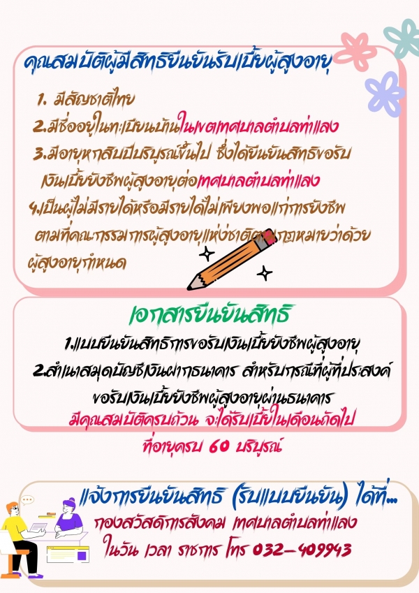 โดยผู้สูงอายุที่มีสิทธิรับเบี้ยยังชีพผู้สูงอายุรายใหม่ ที่ยังไม่เคยลงทะเบียนมาก่อน