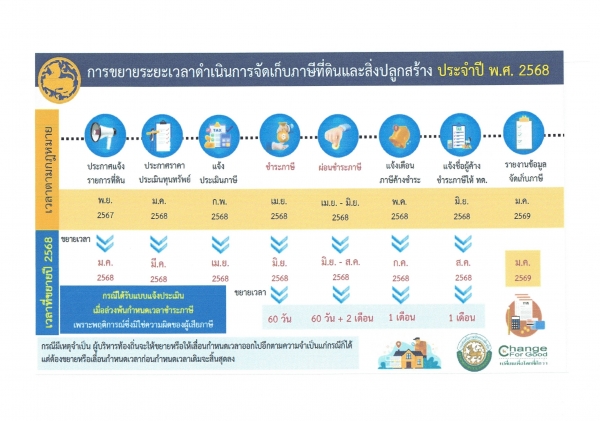 เรื่อง ขยายกำหนดเวลาการดำเนินการตามพระราชบัญญัติภาษีที่ดินและสิ่งปลูกสร้าง ประจำปี พ.ศ. 2562 เฉพาะการจัดเก็บภาษีที่ดินและสิ่งปลูกสร้าง ประจำปี พ.ศ. 2568
