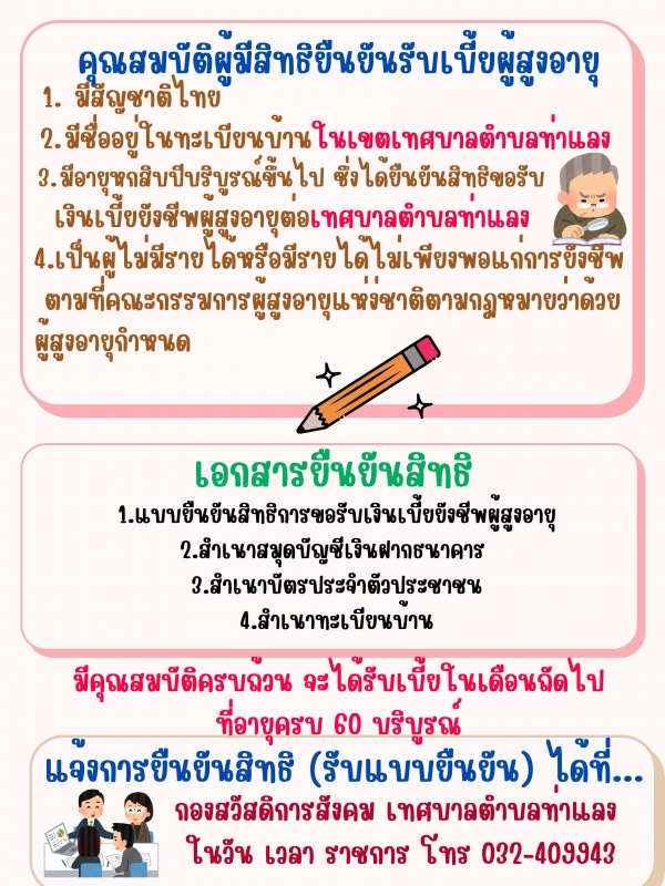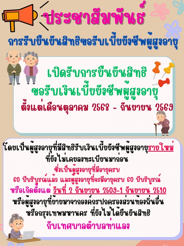 รับยืนยันสิทธิผู้ขอรับเบี้ยผู้สูงอายุ ประจำปีงบประมาณ พ.ศ.2569 (เพื่อรับเบี้ยในปี 2570) ตั้งแต่เดือนตุลาคม 68-กันยายน 69
