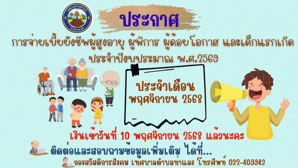 เบี้ยยังชีพผู้สูงอายุ ผู้พิการ ผู้ด้อยโอกาส และเด็กแรกเกิด ประจำเดือนพฤศจิกายน 2568 (เงินเข้าวันที่ 10 พฤศจิกายน 2568) เรียบร้อยแล้ว ดู 26