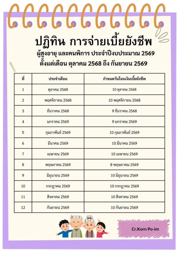 ปฏิทินการจ่ายเบี้ยยังชีพ ผู้สูงอายุ และผู้พิการ ประจำปีงบประมาณ พ.ศ.2569 (ตั้งแต่ตุลาคม 68- กันยายน 69) ดู 37
